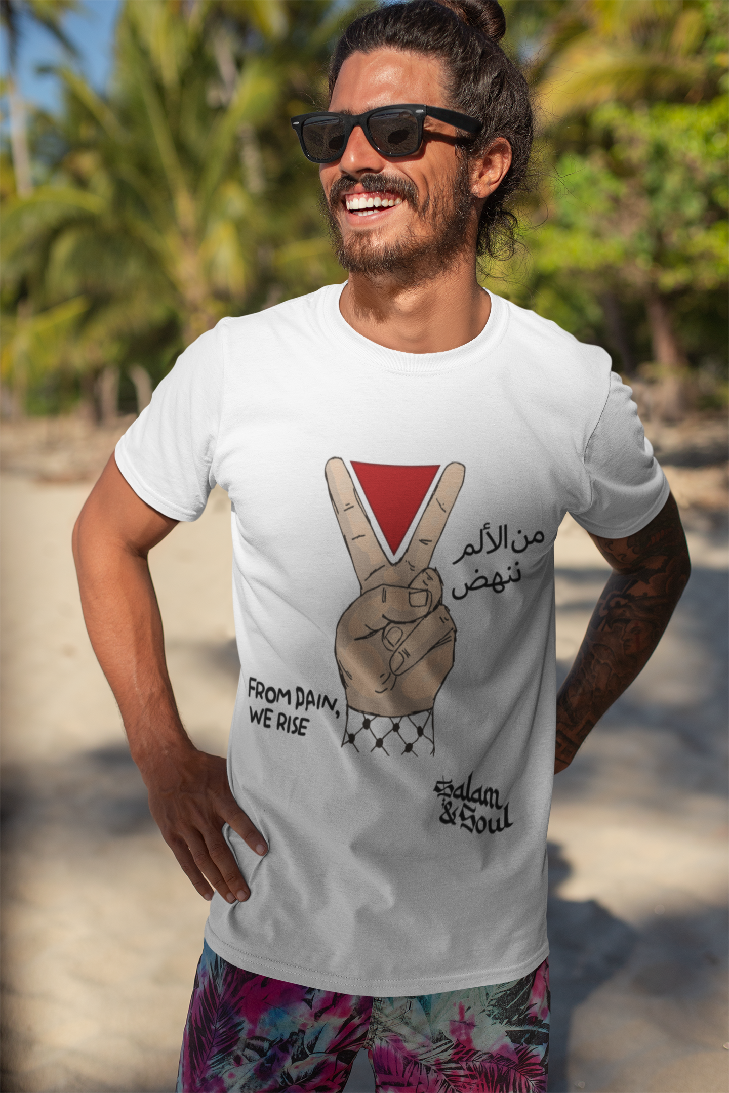 Der Frontprint zeigt das Victory-Zeichen, begleitet von den Worten „From Pain, We Rise“ – „من الألم ننهض“.